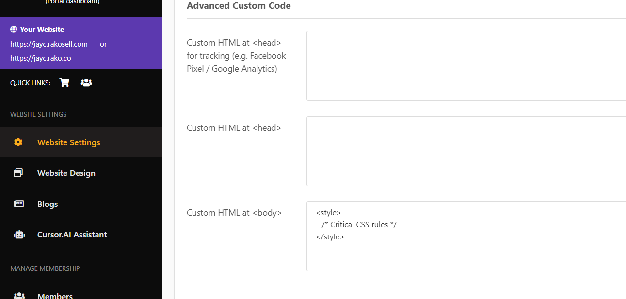 In the Rakosell backend under "Site Settings," you can input various custom codes in Custom HTML to effectively optimize your website. Below are some commonly used codes by the editor (it is recommended to paste the code within the \<head> tags):