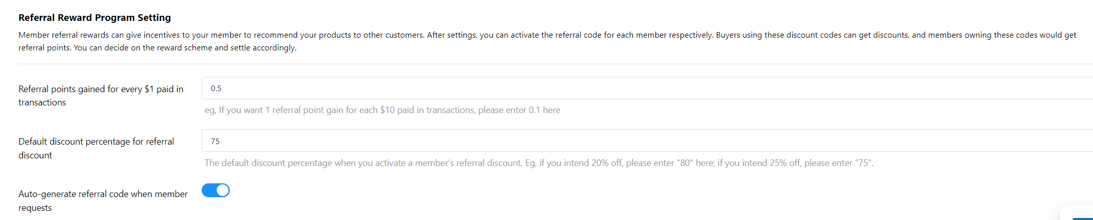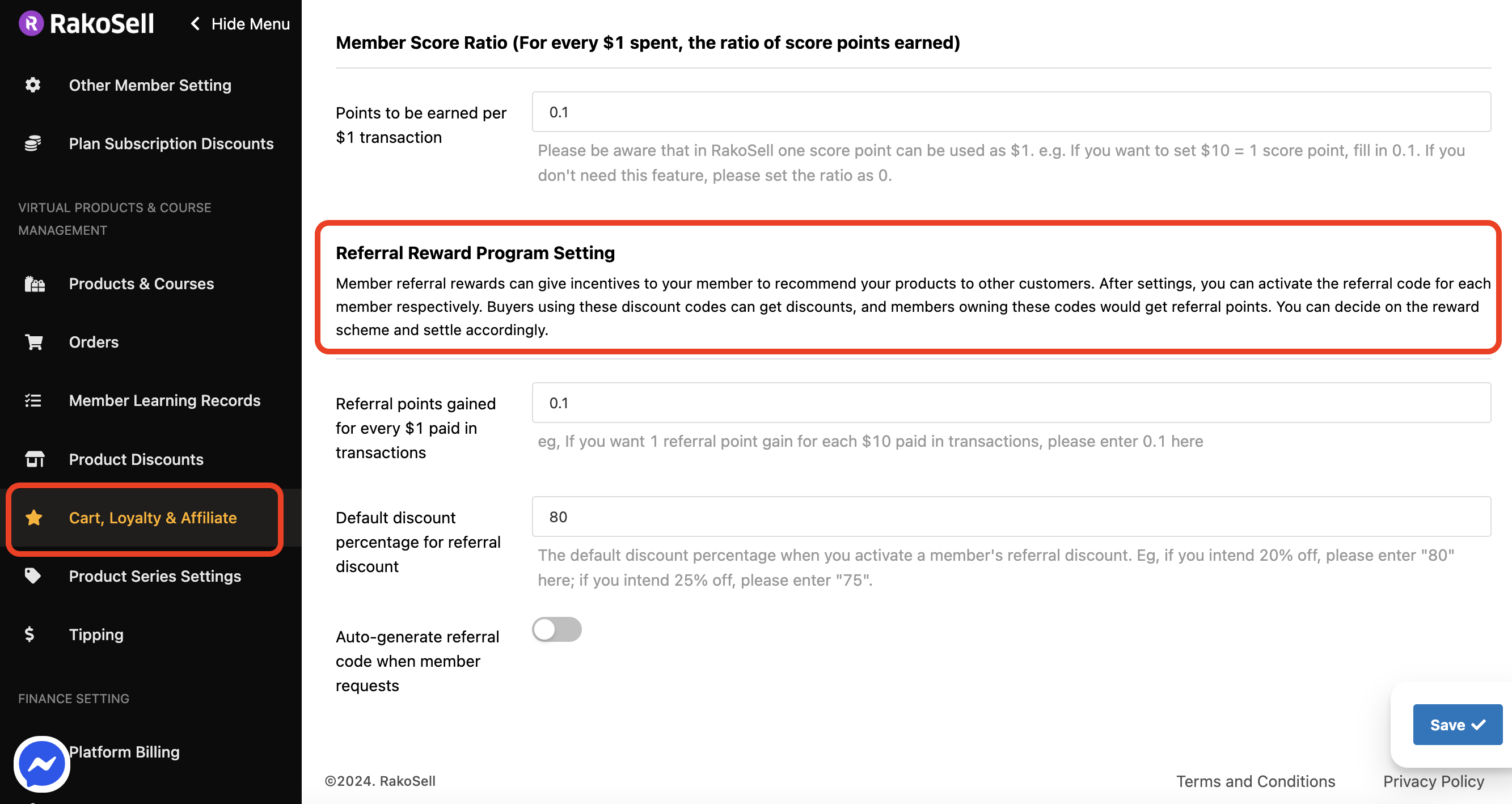 Go to the left-sided menu and click the "Cart, Loyalty & Affiliate" Setting. Scroll down to the "Member Referral Reward Program" section, configure the points earned per $1 spent by the referrer, and set the default discount percentage applied to the referral code. Click "Save" to apply your changes.&#x20;