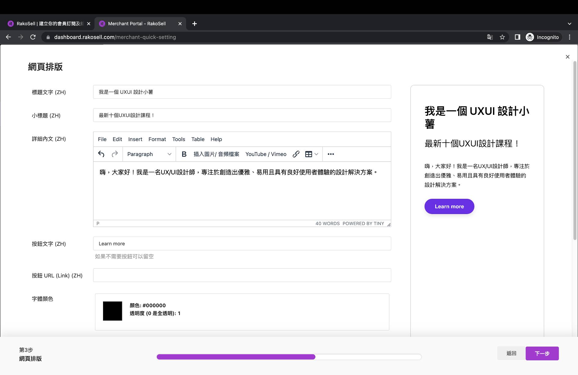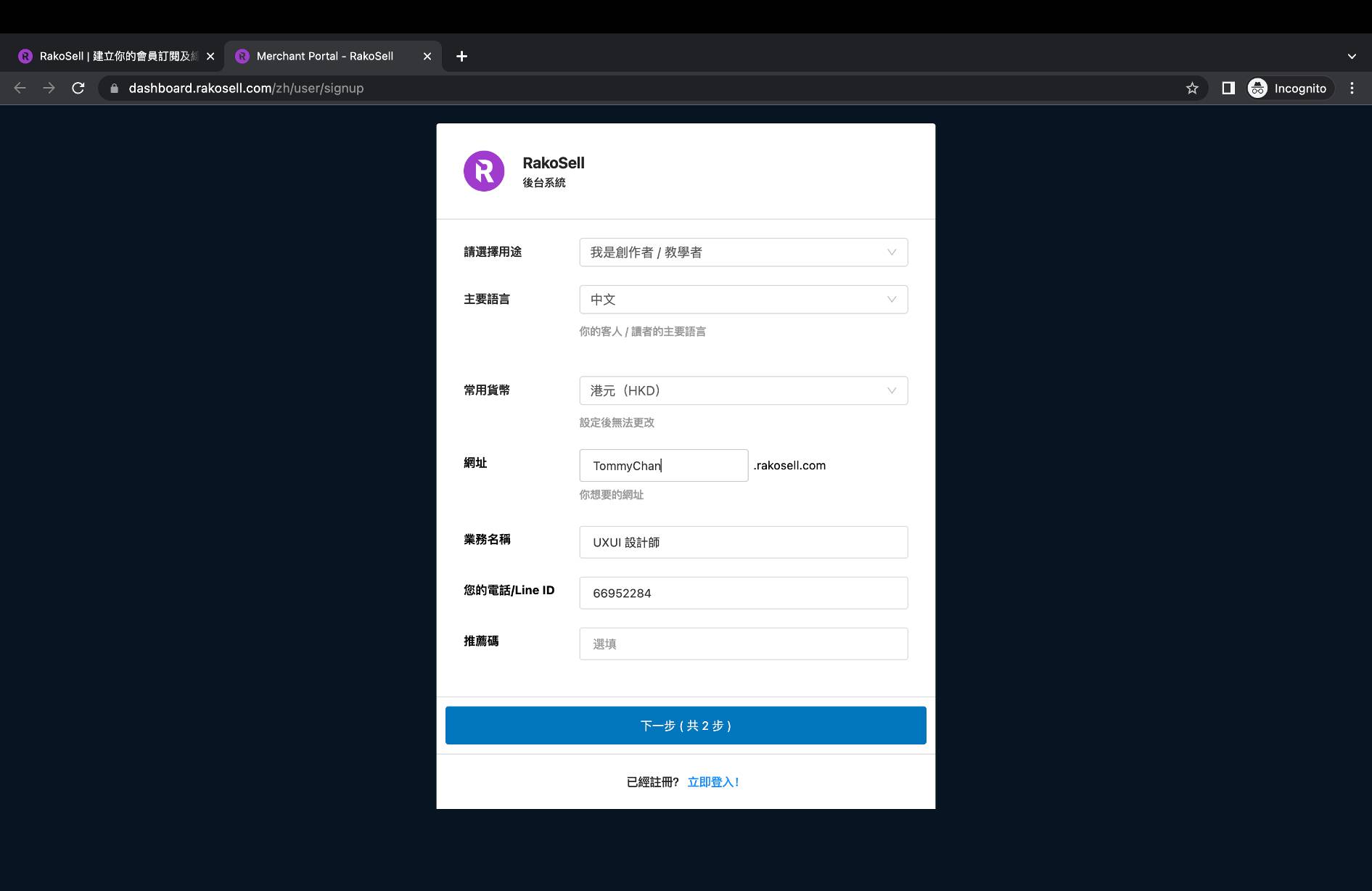 * 填寫你的基本資料和設定。你亦可以填寫你獨一無二的網址，例如你的名字叫 Tommy Chan，你便可以填寫你的網址成為 「Tommychan.rakosell.com」，如果你有推薦碼的話，輸入後更可享有折扣優惠。