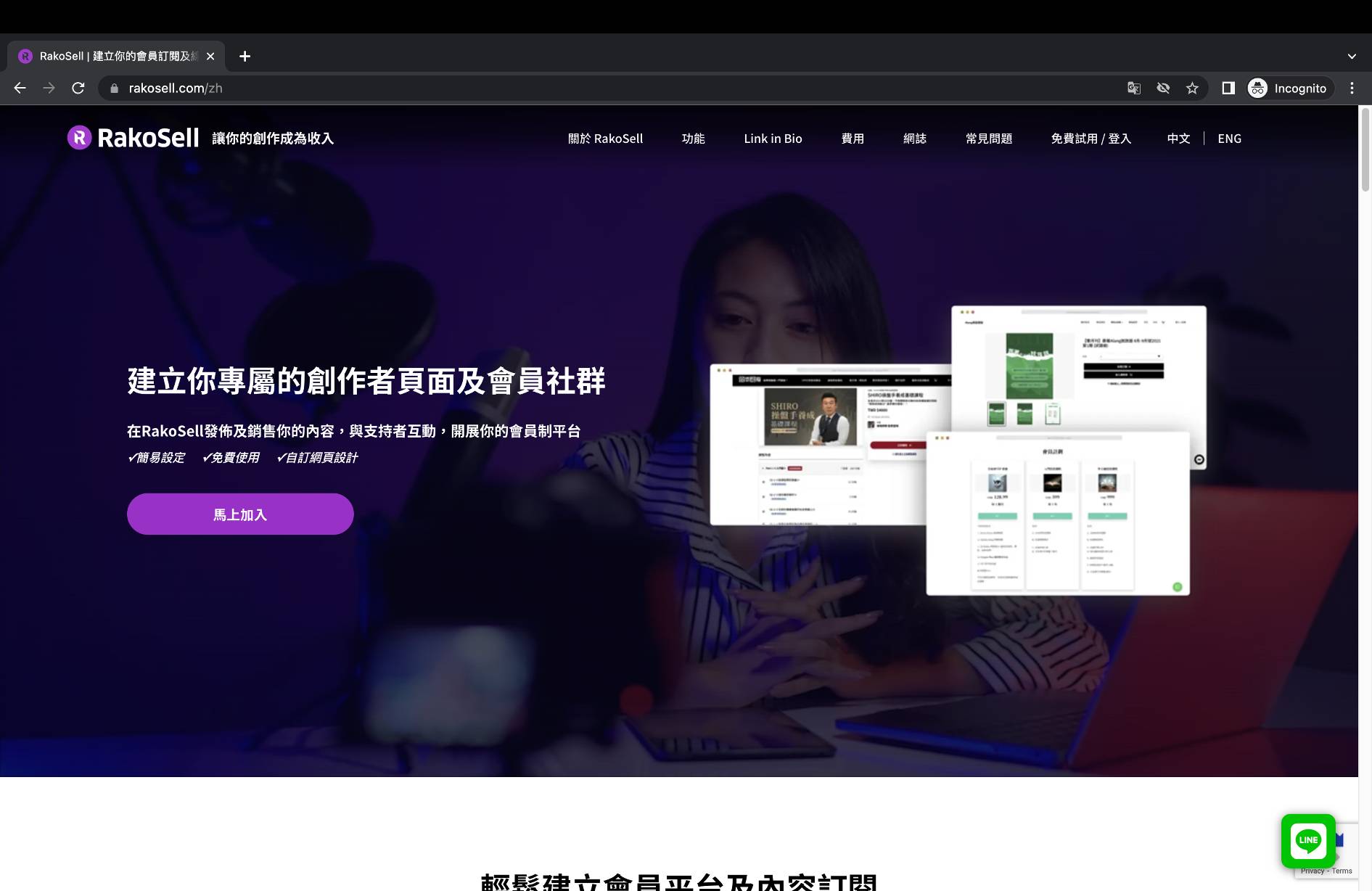 * 首先進入 [Rakosell](https://rakosell.com/zh) 的官方網站，然後在右上角按「免費試用/登入」