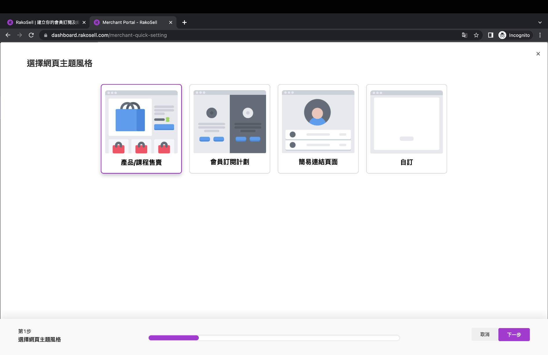 * 確定之後你便成功登陸 Rakosell了！首先你可以選擇你的主題風格，若然你是一位設計師想售賣設計課程，你便可以選擇「產品/課程售賣」。若然你已有固定粉絲群，你也可以選擇「會員訂閱計劃」，讓他們訂閱你獨一無二的內容。