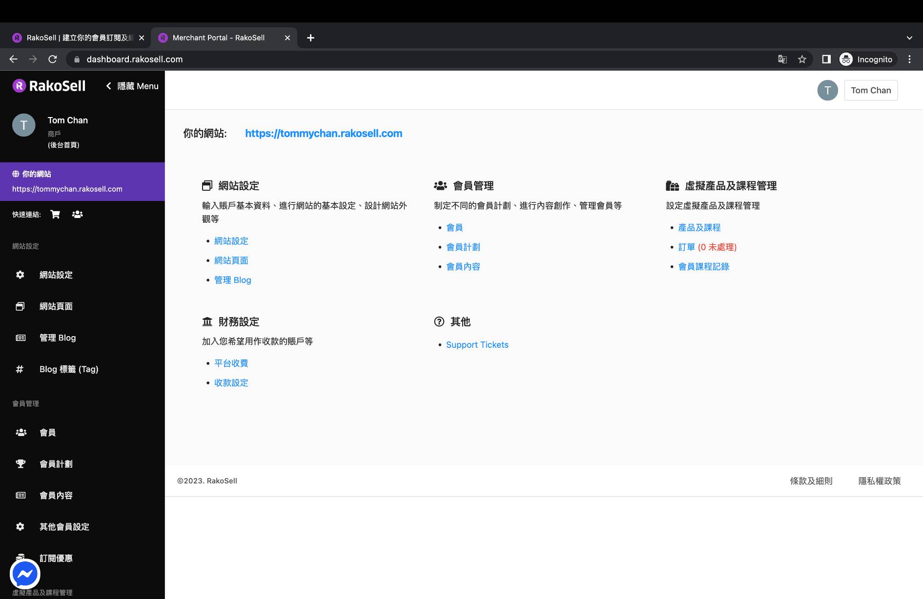 * 然後你會看到你的後台資料，無論是網站設定、會員管理、虛擬產品和課程管理等都可以在後台上看到。若然你有其他問題都可以隨時按「Support tickets」讓我們的Rakosell專員為你解答你的疑問。