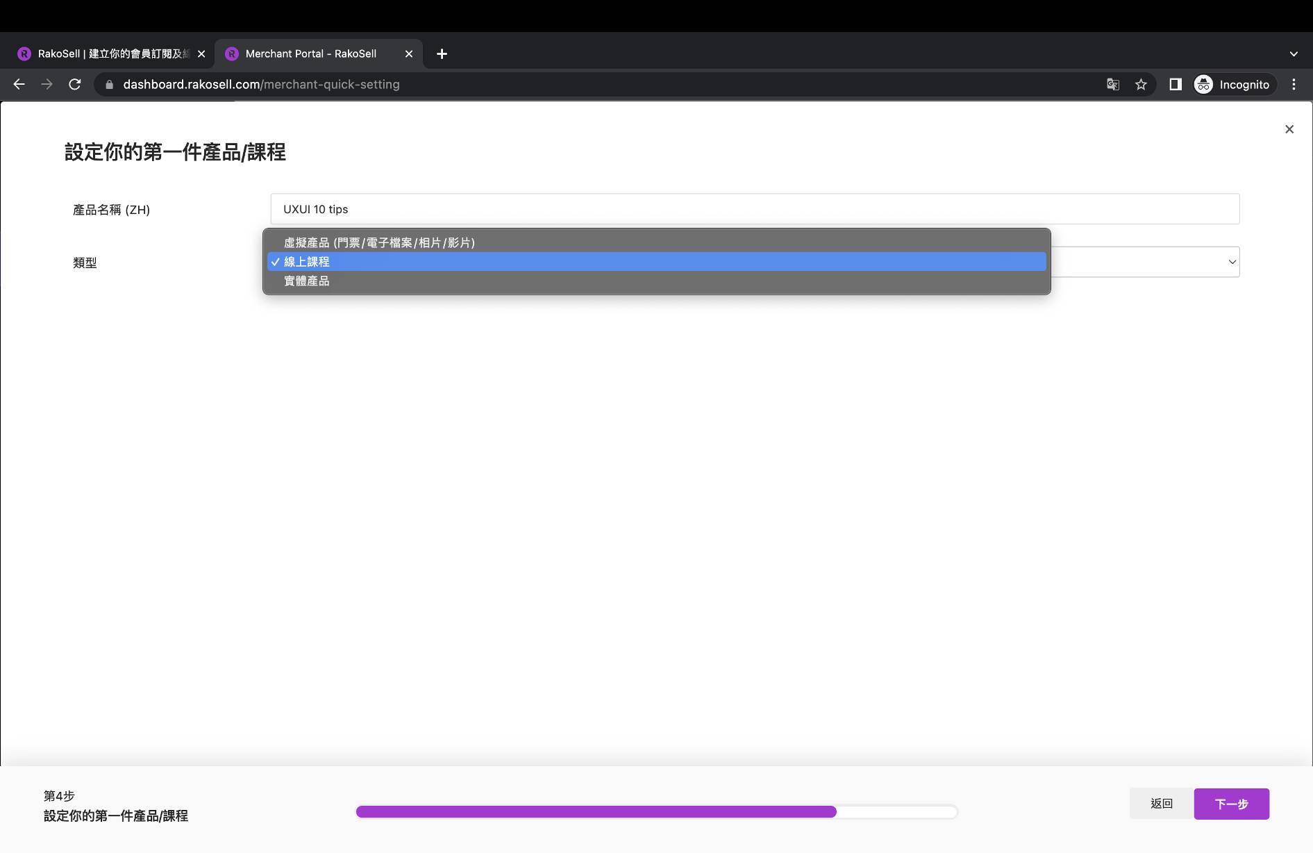 * 然後你便可以立即設定你的第一件產品或課程。輸入完產品名稱和選擇類別後，你便成功設定了你的第一件產品！