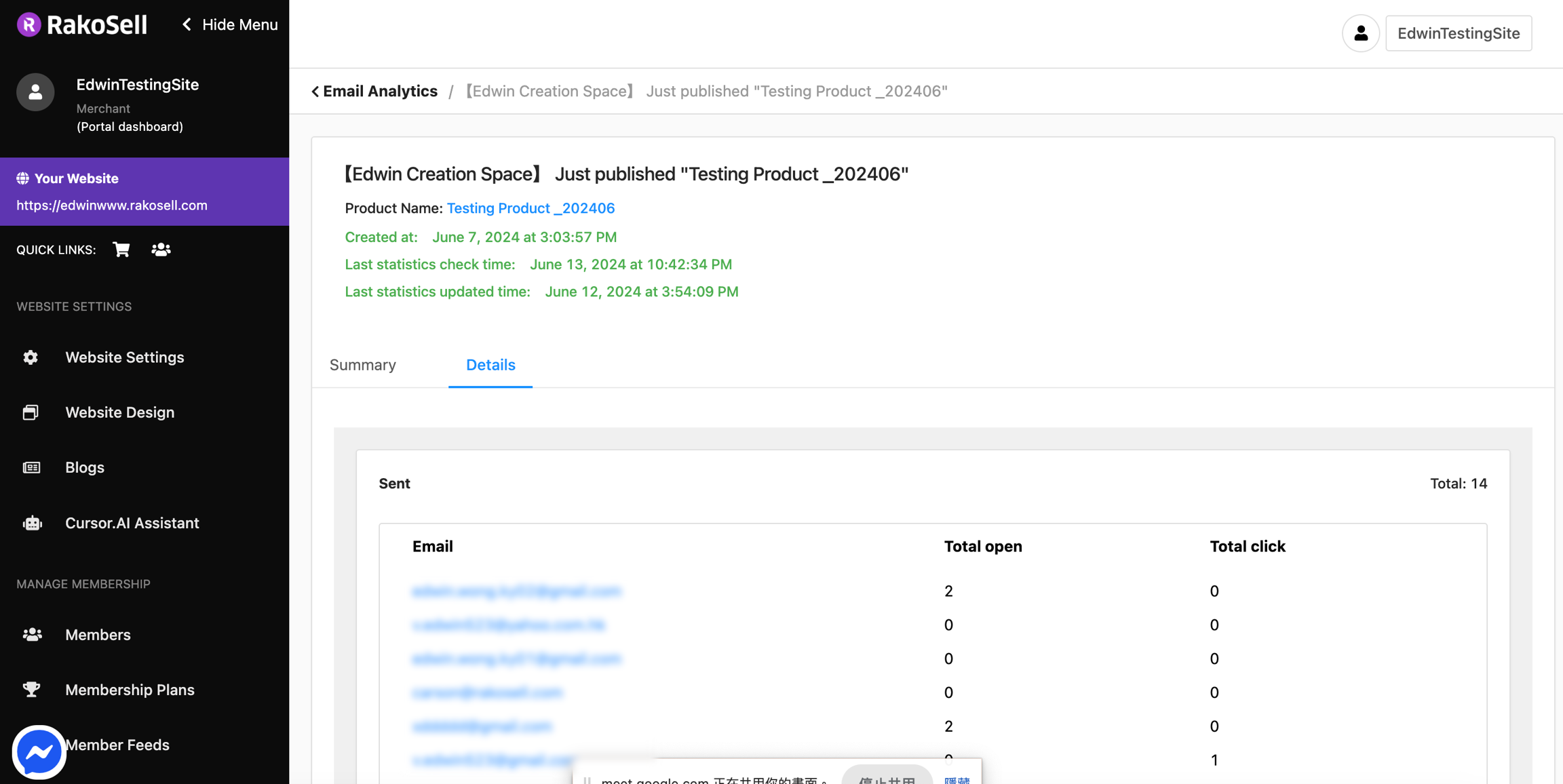 成為Rakosell進階計劃用戶後,在後台會出現"電郵統計分析"功能。