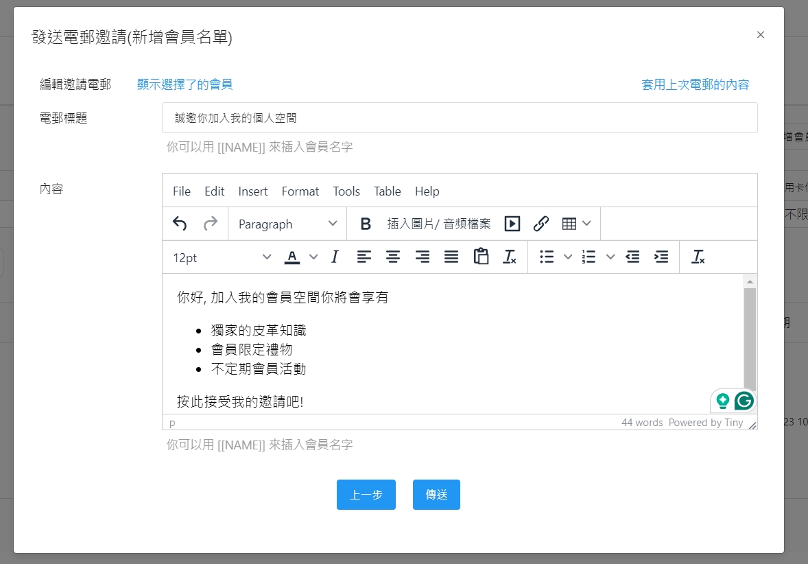 設定:會員 -> 發送電郵邀請(新增會員名單) -> 輸入電郵地址及內容