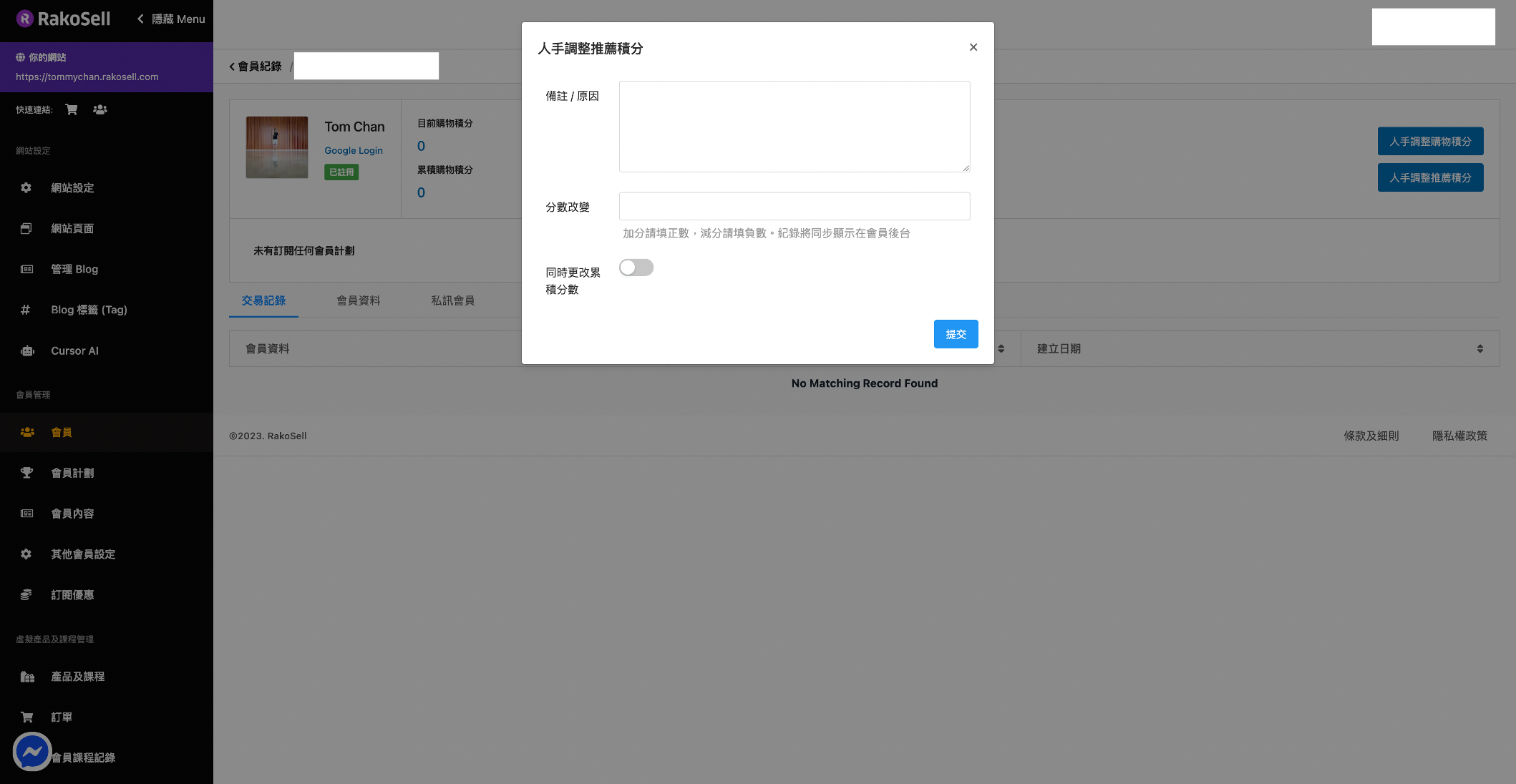 * 你可以因應不同情況，在右上方**人手調整推薦積分，積分將即時反映在會員帳戶中，其加入新的修改紀錄於交易紀錄中。**