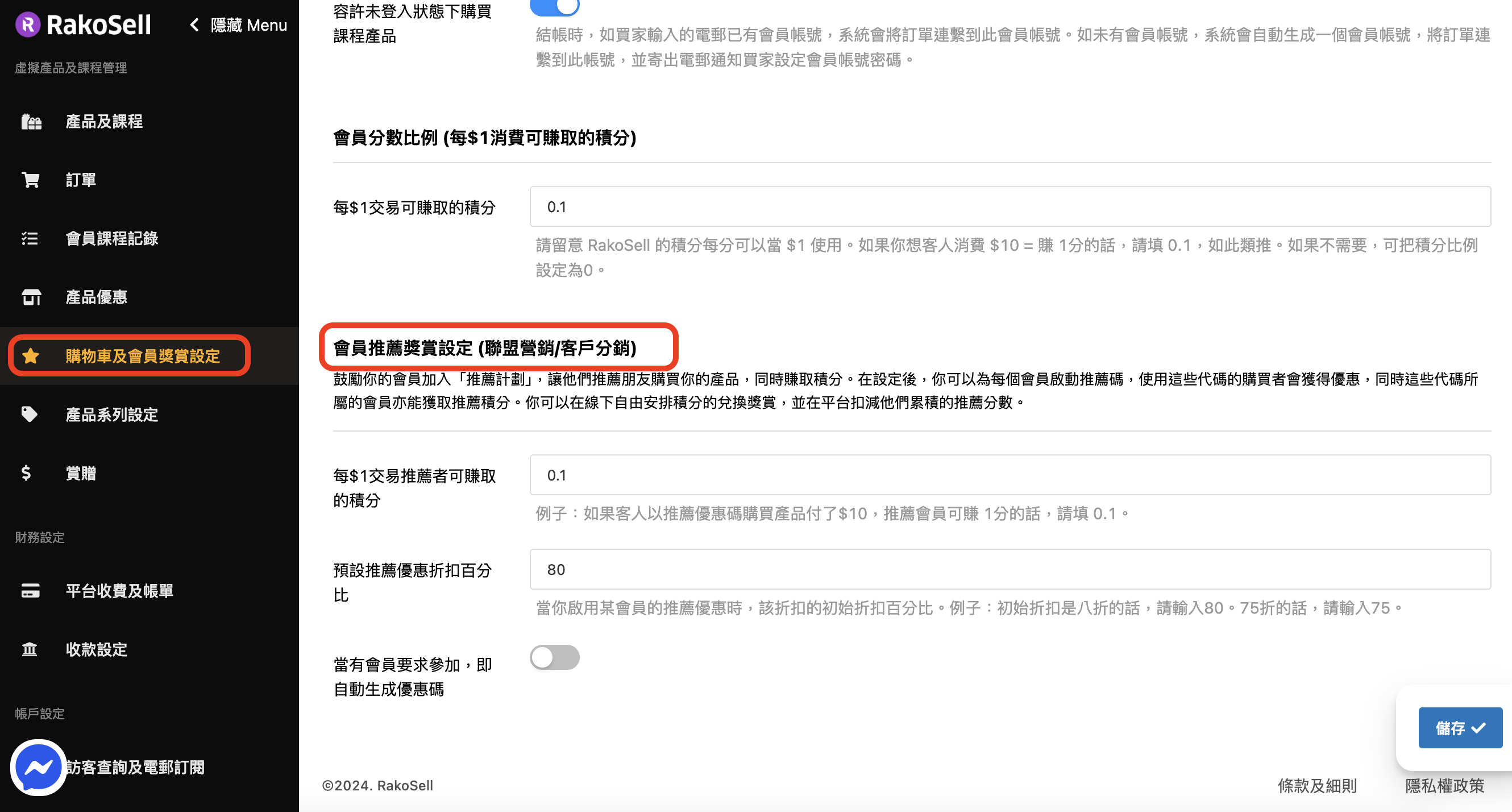 * 首先在左方菜單，打&#x958B;**「購物車及會員獎賞設定」**，於頁面往下拉，在下方找到會員推薦獎賞計劃設定，此處你可以設定每$1 交易推薦者可取的積分，及預設推薦優惠折扣百分比，然後&#x6309;**「儲存」。**\